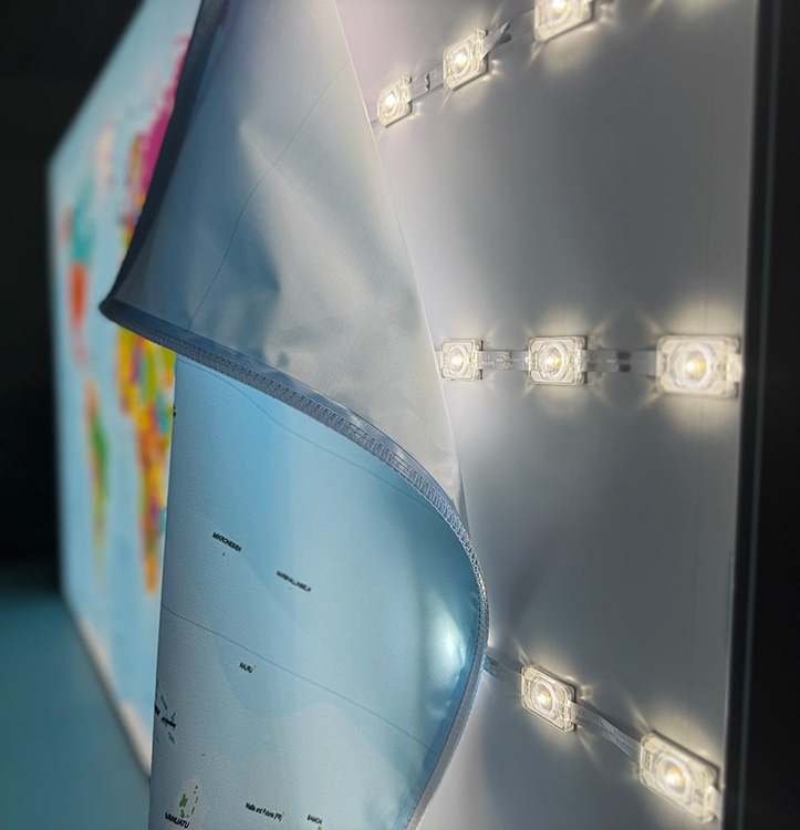 Die Beleuchtung des Textilspannrahmens erfolgt mittels speziellen LED-Modulen, die auf der Rückwand des Alu-Textilspannrahmens angebracht werden. Dieser Weg der Hinterleuchtung garantiert eine optimale Ausleuchtung des Rahmens, da die LEDs in gleichmäßig verteilten Abständen auf die Rückwand geklebt werden. Die Abstände der LED-Reihen werden speziell an die Maße Ihres Rahmens individuell angepasst.